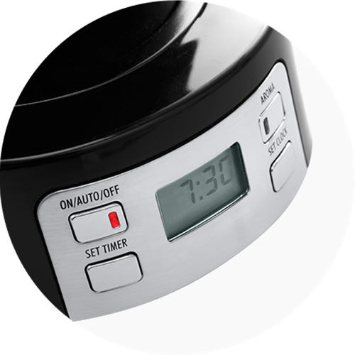 Система управления кофеваркой - электронная. Вы легко можете включать и выключать прибор, пользоваться таймером, откладывающим запуск на срок до 24 часов. Просто установите таймер накануне вечером и проснитесь с ароматом свежесваренного кофе. А благодаря функции Aroma вы так же можете отрегулировать крепость кофе. Вся информация о состоянии кофеварки выводится на цифровой дисплей.