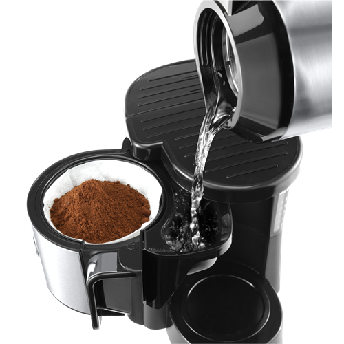 Благодаря тщательно продуманной конструкции можно одновременно пополнять запас воды и молотого кофе в кофеварке, не двигая её.